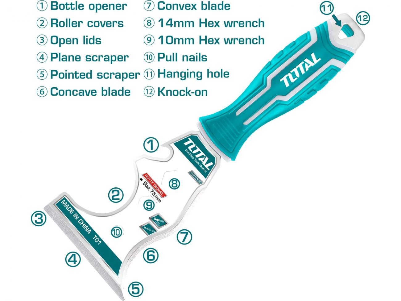 Velikost 75mm (3``)Tloušťka: 1,8 mmTepelně tvrzenoJemně leštěnoFunkce:Č. 1 Čištění krytu válečkuČ.2 Plochá škrabkaČ.3 Bajonetová škrabkaČ.4 DauberČ.5 ŤukČ.6 Konvexní škrabkaČ.7 Konkávní škrabkaČ.8 Malý šestihranný šroubovákČ.9 Velký šestihranný šroubovákČ.10 Odstraňovač sponekČ.11 Otvírák na láhveČ.12 Otvor pro zavěšeníIndustriální kvalita.