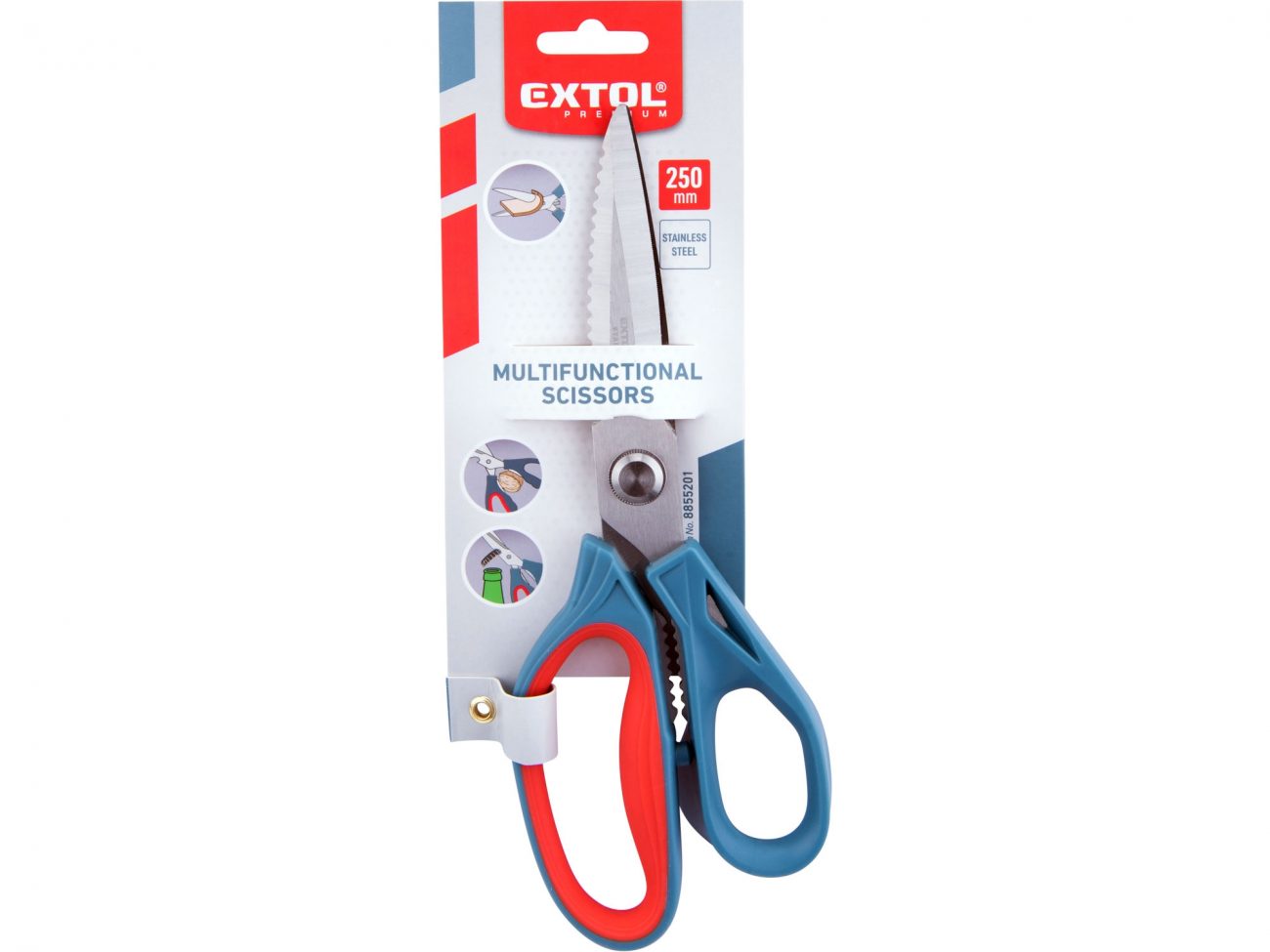 Masivní nerezové nůžky extra pevné konstrukce s polypropylenovými rukojeťmi (velká rukojeť je uvnitř měkčena pryží) a nerezovými čepelemi o tl. 3mm použitelné na stříhání vrstvenného papíru, textilu, kůže, lepenky, provazů, pryže atd. Do části s rukojeťmi je zabudován louskáčk na ořechy a v části čepele je potom otvírák na láhve Technické parametry: 250mm Doplňující parametr: Délka čepele 130mm Záruka: 24 měs.
