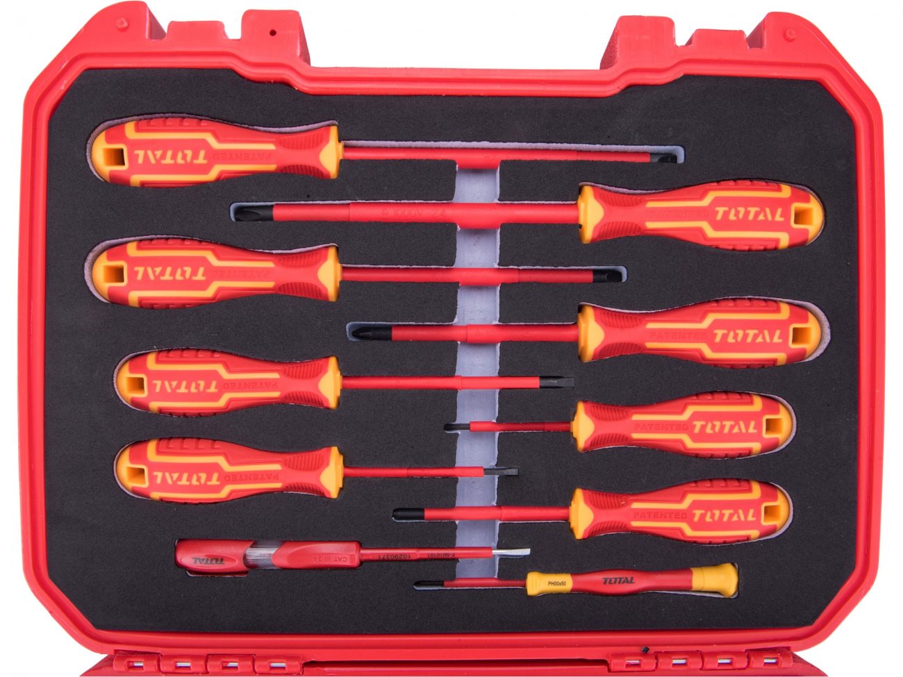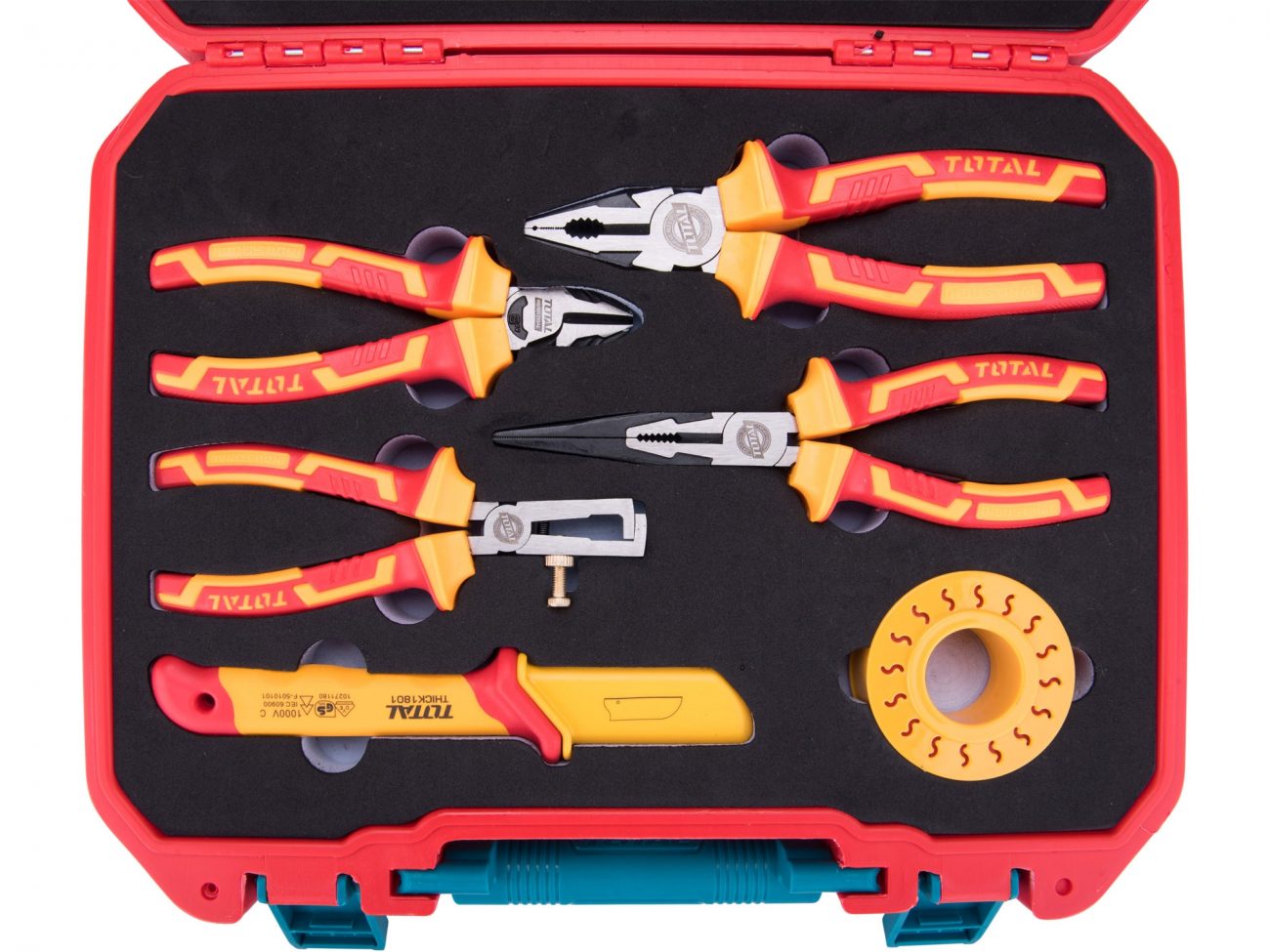 Sada 16ks elektrikářského nářadí je vložena do červeného kufru z tvrzeného PVC. Všechny komponenty nářadí jsou držitely certifikací 1000V,VDE/GS. Nářadí je v kufru vloženo do výřezů z tvrdé pěny, který je specifický pro každý typ nářadí. Víte tedy přesně, kam po dokončení práce co uložit. V pěnové výplni je elegantně vyřešeno vyndávání nářadí. Pro šroubováky je uprostřed otvor pro prst a úchop přední strany šroubováku, pro kleště je po stranách otvor pro palec a ukazováček. Sada obsahuje tyto druhy nářadí: 1ks 200mm elektrikářské kombinované kleště, 1ks 200mm elektrikářské přímé kleště, 1ks 160mm elektrikářské boční štípací kleště, 1ks 160mm elektrikářské kleště na odizolování kabelů, 4ks elektrikářské šroubováky přímé SL3x75mm, SL4.0x100mm;,SL5.5x125mm, SL6.5x150mm, 5ks elektrikářských šroubováků křížových PH00x50mm, PH0x60mm, PH1x80mm, PH2x100mm, PH3x150mm, 1ks 30x70mm zkoušečky napětí, 1ks 50x180mm nůž na kabely, 1ks elektrikářské vinylové pásky Baleno v kufru