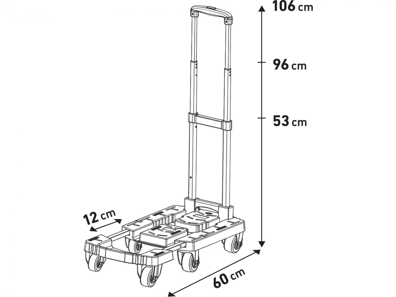 Teleskopická rukojeť s možností její fixace ve třech výškách 53-96-106cm (měřeno od podlahy) a také možností nastavení jak pro tlačení tak i tažení vozíku (push&pull mode), kdy pro tlačení lze rukojeť zafixovat k podstavě vozíku a pro tažení je rukojeť naopak ve směru výšky variabilně polohovatelná Díky šesti tichým kolečkům (4kolečka jsou otočná) je vozík manévrovatelný ihned z místa do všech směrů Technické parametry: Nosnost až 200kg/6koleček Doplňující parametr: Nastavitelná užitná plocha 48-60cm x 32cm, velikost ve složeném stavu 48 x 32 x 11cm, pevná konstrukce z PP s pryž. protiskluznými terčíky a teleskopickou rukojetí, hmotnost 3,5kg Záruka: 24 měs.