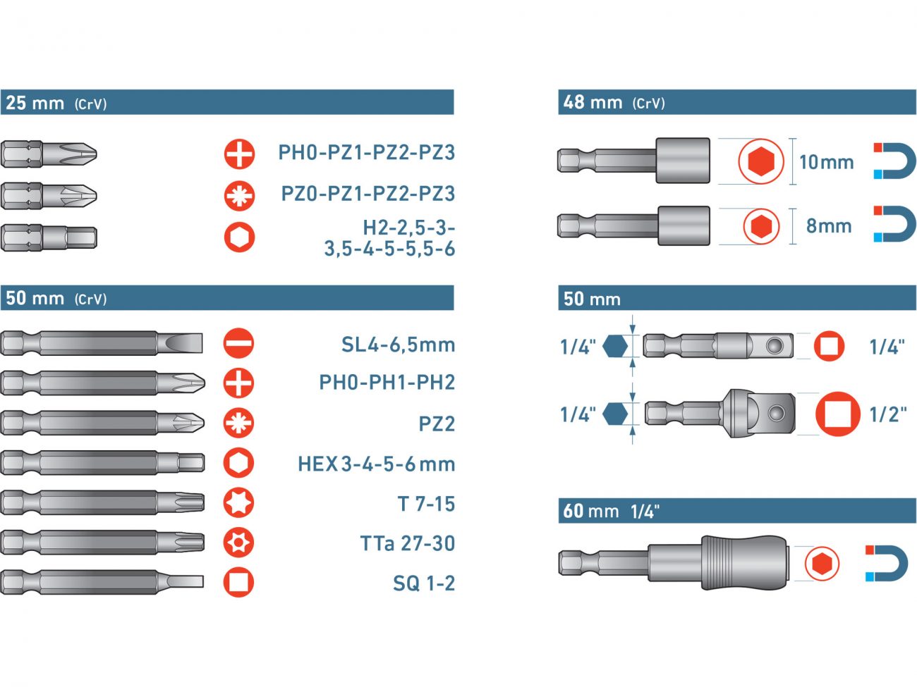 Materiál: CrV Doplňující parametr: Hroty 25mm: PH 0-1-2-3, PZ 0-1-2-3, HEX 2-2,5-3-3,5-4-5-5,5-6mm, hroty 50mm: (-) 4-6,5mm, PH 0-1-2, PZ2, HEX 3-4-5-6mm T 7-15, TTa 27-30, SQ 1-2, nástrčné hlavice 48mm: 8-10mm, adaptéry 50mm: 1/4"čtyřhran-1/4"hex, 1/2"čtyřhran-1/4"hex, magnetický držák 1/4" hrotů Fix-Clip 60mm, Záruka: 24 měs.