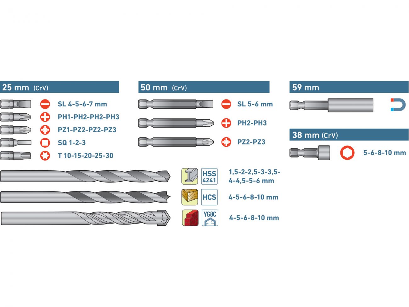 Vrtáky do kovu jsou vyrobeny z materiálu HSS-4241; vrtáky do zdiva mají plátek z SK(slinutého karbidu); všechny hroty a nástrčné hlavice jsou z CrV oceli Materiál: HSS, CrV, SK Doplňující parametr: Vrtáky do kovu(HSS-4241) : O 1,5-2-2,5-3-3,5-4-4,5-5-6mm; vrtáky do dřeva(HCS): O 4-5-6-8-10mm; vrtáky do zdiva(SK-YG8C): O 4-5-6-8-10mm; hroty 1/4"x25mm: (-) 4-5-6-7mm, PH1-2-2-3, PZ1-2-2-3, TORX T10-15-20-25-30, SQ 1-2-3; hroty 1/4"x50mm: (-) 5-6mm, PH2-3, PZ2-3; nástrčné hlavice (38mm): 5-6-8-10mm; magnet.nástavec na hroty 1/4"x59mm Záruka: 24 měs.