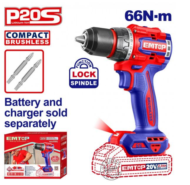 Šroubovák vrtací aku 20V 66Nm EMTOP (bez baterie)