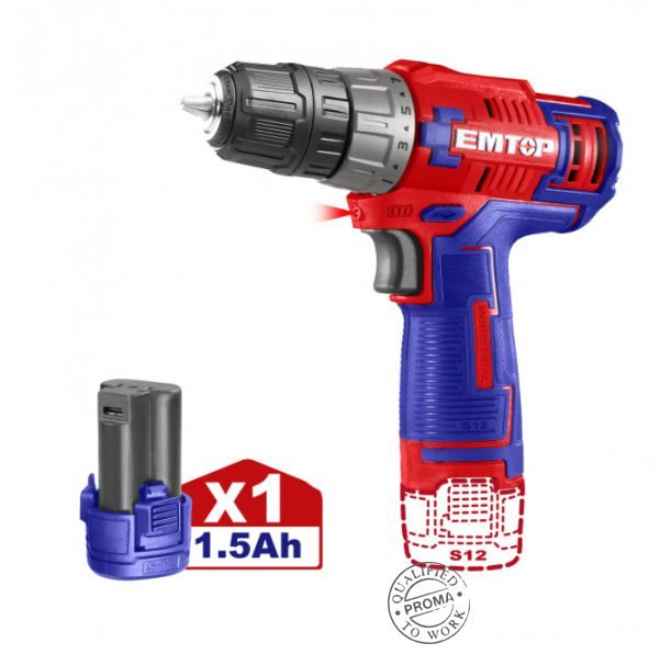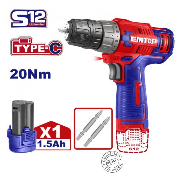 Šroubovák vrtací aku 12V 20Nm 1x1.5Ah EMTOP