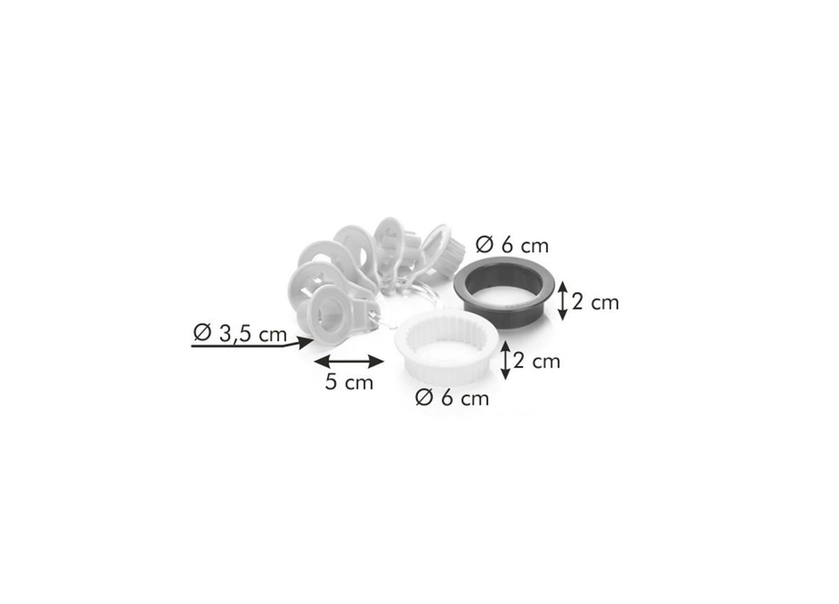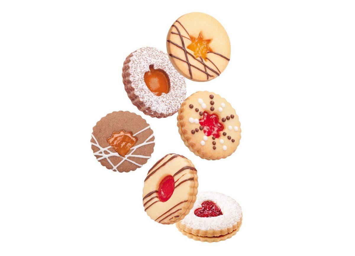 • Dvě kulatá vykrajovátka s rovným a vlnitým okrajem a šest mini vykrajovátek s tradičními motivy pro vykrojení středů.