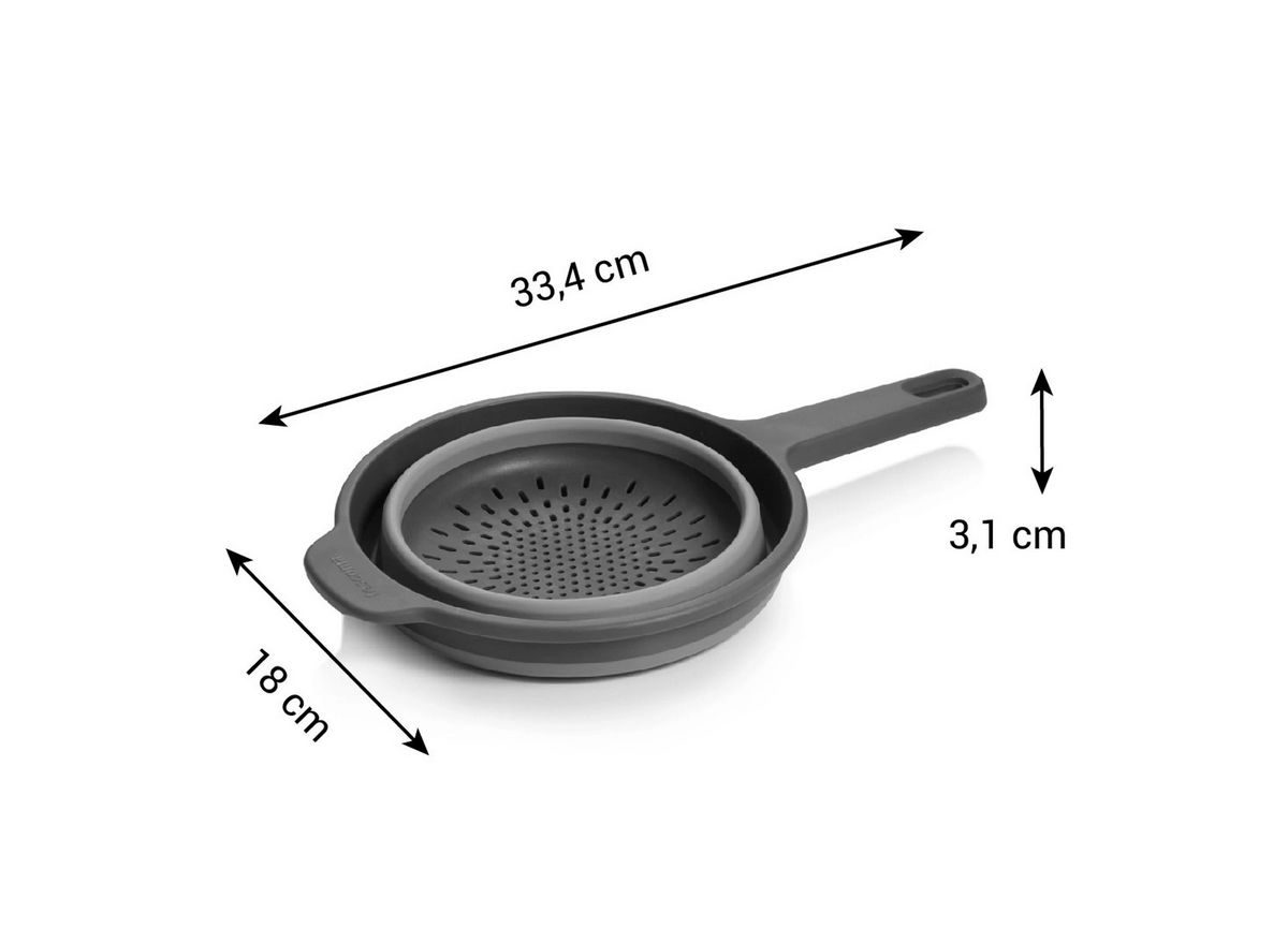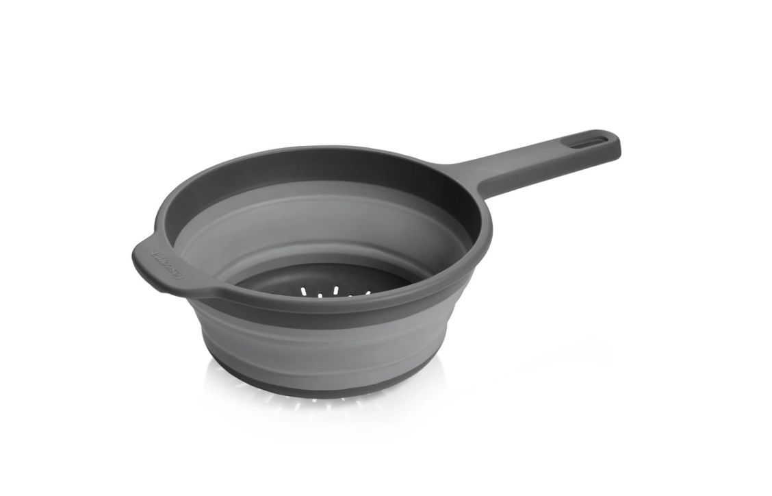 • V rozloženém stavu je cedník GrandCHEF dostatečně prostorný, po použití jej snadno složíte do plochého tvaru, takže zabírá minimum místa.