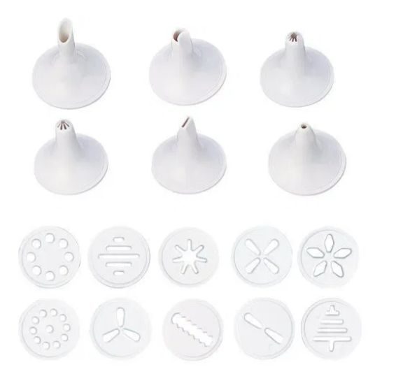 Lis na těsto, vynikající pro přípravu sladkých i slaných sušenek, ke zdobení dortů, zákusků, chlebíčků, obložených mís apod, 10 lisovacích kroužků a 6 dekoračních trysek