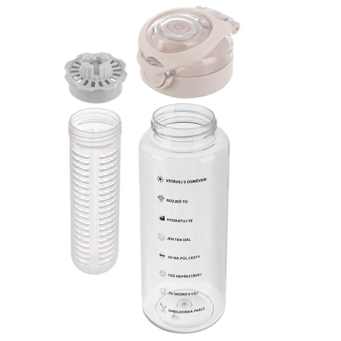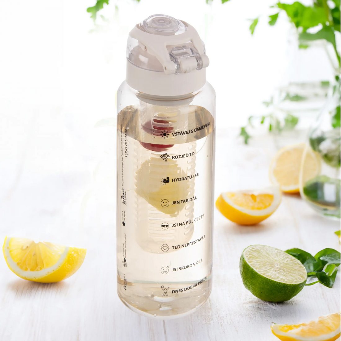 - Láhev s pítkem, filtrem na ovoce a bylinky, víčkem a uchem na zavěšení.