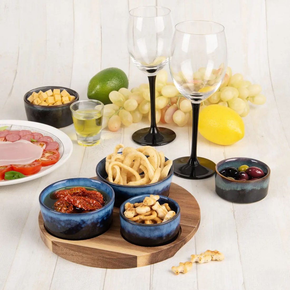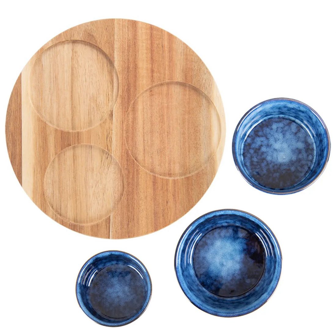 • Sada 3 kameninových mističek s velmi zajímavou glazurou na akáciovém tácku ozvláštní servírování a podávání pohoštění. Skvěle se hodí na brambůrky, olivy, křupky, preclíčky, sýry, uzeninu, krekry... Nebo na servírování zeleniny a dipů. Mix 2 barev glazury.