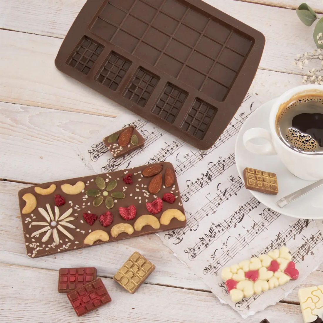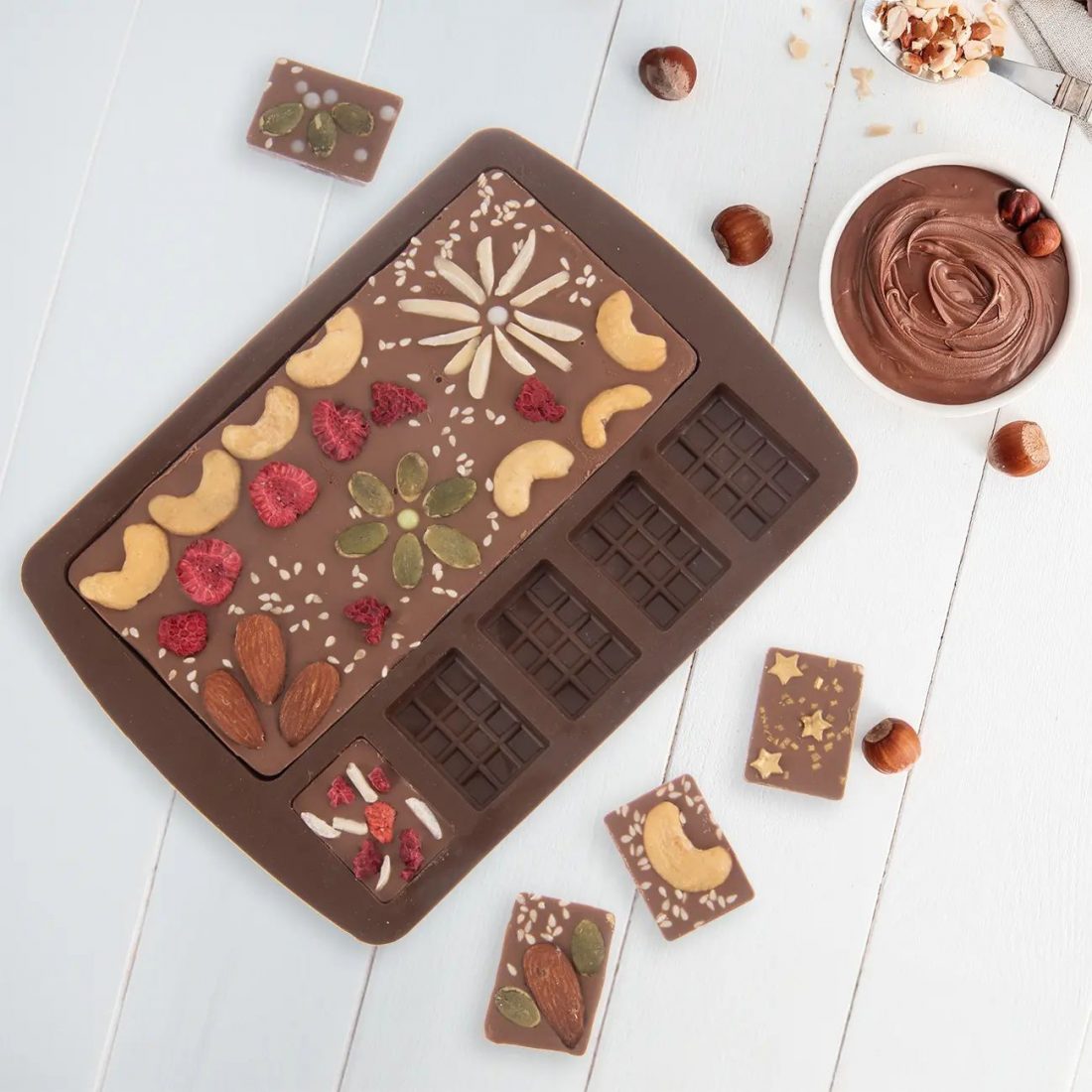 • Forma na čokoládu vám pomůže připravit čokoládové tabulky a mini čokoládky přesně podle vašich představ. Mohou být bílé, světlé, tmavé, mramorované, barevné, můžete do nich přidat ořechy, sušené ovoce, želé, kousky sušenek, chilli... Receptů je nespočet a vaši fantazii meze neklademe. Vše rozpustíte ve vodní lázni, nalijete do forem a necháte v chladu ztuhnout.