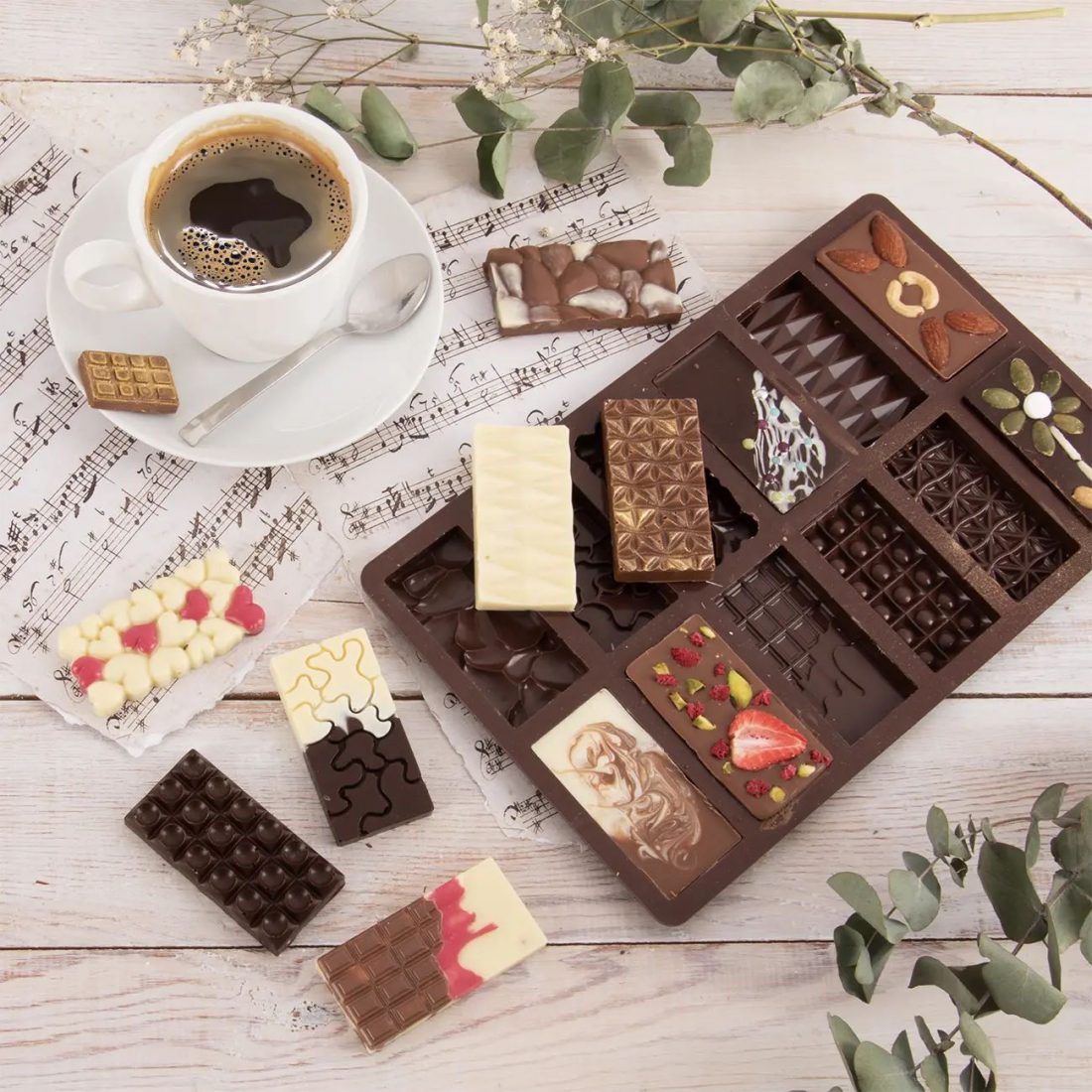 • Forma na čokoládu vám pomůže připravit tvarované čokoládové tabulky přesně podle vašich představ. Mohou být bílé, světlé, tmavé, mramorované, barevné, můžete do nich přidat ořechy, sušené ovoce, želé, kousky sušenek, chilli... Receptů je nespočet a vaši fantazii meze neklademe. Vše rozpustíte ve vodní lázni, nalijete do forem a necháte v chladu ztuhnout.